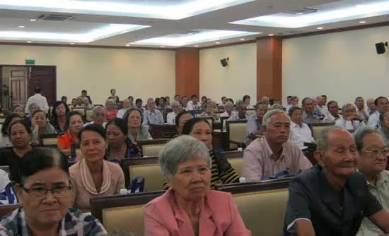 Các cựu cán bộ, chiến sĩ Ban Trí Vận – Mặt trận Khu ủy Sài Gòn-Gia Định họp mặt tại hội trường TP sáng 21/4. Ảnh: Lệ Loan