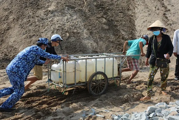 Người dân ở đây "khát" nước ngọt trầm trọng vì thế khi có tàu chở nước ngọt của BTL Vùng Cảnh sát biển 3 cập bến, họ vui mừng chuẩn bị dụng cụ, thùng để đi chở nước ngọt. Mỗi hộ được cấp 1 m3 nước ngọt, đây là số lượng nước ngọt không lớn nhưng lại rất quý giá đối với mỗi hộ gia đình hiện nay, nên nhiều hộ không kịp sắm dụng cụ, phải trữ trong hố trải bạt trong vườn để sử dụng dần. Dọc bờ sông nơi tàu cấp nước, người dân tập trung chờ đợi rất đông và rất sớm để được đón nhận nguồn nước ngọt quý giá này.