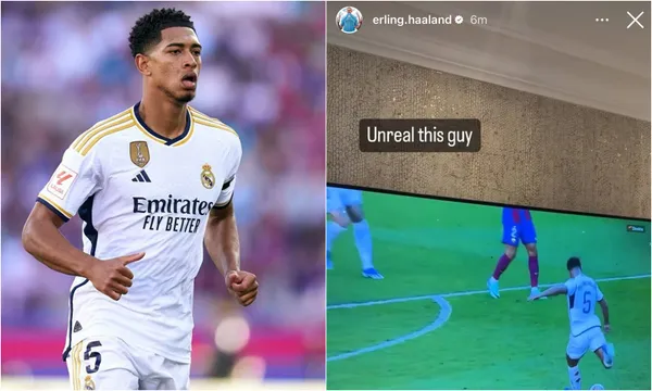 Trên Instagram cá nhân, Erling Haaland chia sẻ hình ảnh ngồi theo dõi trận El Clasico giữa Real Madrid và Barca. Cầu thủ thuộc biên chế Man City viết dòng chữ “Cậu ta không có thật!” để bày tỏ sự thán phục cho đồng đội cũ Jude Bellingham.