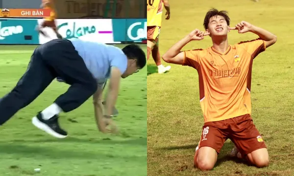 Phấn khích vì cầu thủ vào sân từ băng ghế dự bị, Đinh Quang Kiệt ghi bàn tung lưới đối thủ Thanh Hóa, gỡ hòa 1-1 cho HAGL ở phút 90+10, HLV Vũ Tiến Thành đã có hành động bò trên sân ăn mừng "khó đỡ".