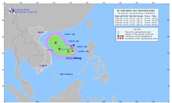 Sáng 10/6, Trung tâm Dự báo Khí tượng Thủy văn Quốc gia ghi nhận vùng áp thấp trên khu vực Bắc Biển Đông đã mạnh lên thành áp thấp nhiệt đới.