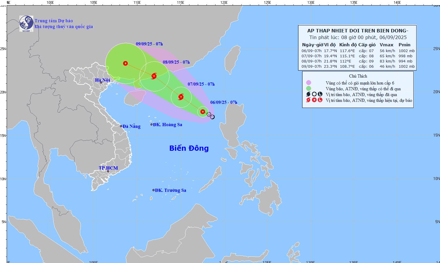 Dự báo đến 1h ngày 7/9, áp thấp nhiệt đới tiếp tục di chuyển theo hướng Tây Bắc với tốc độ 10 – 15 km/h và có khả năng mạnh lên thành bão, cách quần đảo Hoàng Sa khoảng 430 km về phía Đông Bắc. Sức gió mạnh cấp 8, giật cấp 10. Khu vực chịu ảnh hưởng trực tiếp là vùng biển phía Đông Bắc Biển Đông. Cấp độ rủi ro thiên tai: cấp 3.