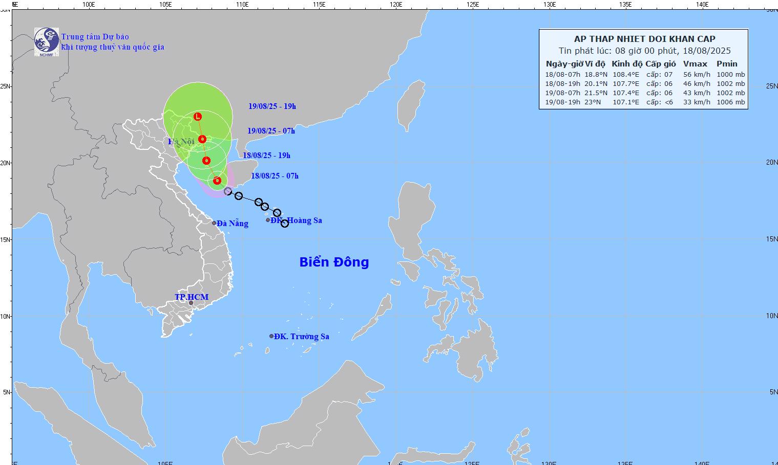 Trong dự báo 36 giờ tới, đến 7 giờ ngày 19/8, áp thấp nhiệt đới sẽ di chuyển theo hướng Tây Bắc với tốc độ khoảng 15 km/giờ. Vị trí tâm ở khoảng 21,5 độ Vĩ Bắc; 107,4 độ Kinh Đông, trên khu vực Quảng Ninh – Lạng Sơn. Cường độ gió duy trì cấp 6, giật cấp 8. Vùng nguy hiểm được xác định là khu vực phía Bắc vĩ tuyến 18,5 độ Vĩ Bắc và phía Tây kinh tuyến 109,0 độ Kinh Đông.
