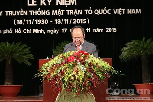 Chủ tịch UBMTTQ TPHCM Nguyễn Hoàng Năng phát biểu tại lễ kỷ niệm 85 năm ngày truyền thống MTTQ tại TPHCM - Ảnh: CATP.