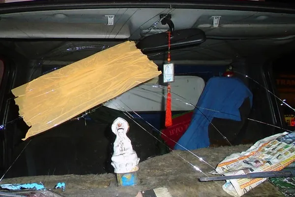 Tài xế lấy băng keo dán lại vết nứt, vỡ kính phía trước xe do bị ném đá trên đường cao tốc Long Thành - Dầu Giây (Ảnh do VEC E cung cấp)