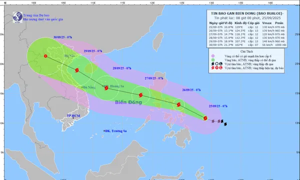 Dự báo khoảng đêm 26/9, bão Bualoi sẽ đi vào vùng biển phía Đông khu vực giữa Biển Đông, trở thành cơn bão số 10 năm 2025.