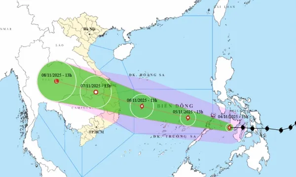 Từ ngày 5 – 6/11, khu vực giữa Biển Đông (bao gồm vùng biển phía Bắc đặc khu Trường Sa) và vùng biển ngoài khơi từ Đà Nẵng đến Khánh Hòa có khả năng chịu tác động của gió mạnh cấp 12 – 14, giật trên cấp 17, sóng cao 8 – 10 m, biển động dữ dội.