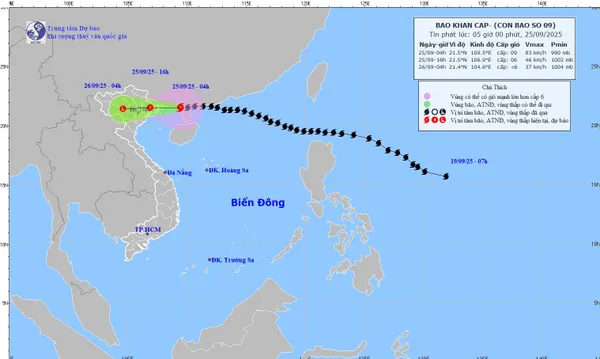 Theo Trung tâm Dự báo khí tượng thủy văn quốc gia lúc 6h sáng nay, tâm bão Ragasa (bão số 9) đang cách Móng Cái (Quảng Ninh) khoảng 120km về phía đông, sức gió mạnh nhất cấp 9 (75-88km/h), giật cấp 11.