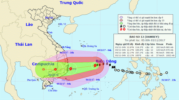 Hồi 04 giờ ngày 03/11, vị trí tâm bão ở vào khoảng 12,8 độ Vĩ Bắc; 114,1 độ Kinh Đông, cách bờ biển Khánh Hòa-Ninh Thuận khoảng 500km về phía Đông. Sức gió mạnh nhất ở vùng gần tâm bão mạnh cấp 10 (90-100km/giờ), giật cấp 13.