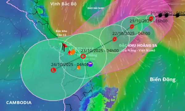 Vùng nguy hiểm trên Biển Đông trong 24 giờ tới được xác định từ vĩ tuyến 15,0 đến 19,0 độ Bắc, kinh tuyến 108,5 đến 113,5 độ Đông. Cấp độ rủi ro thiên tai: cấp 3 (vùng biển phía Tây Bắc Biển Đông, gồm Hoàng Sa; vùng biển từ Nam Quảng Trị đến Quảng Ngãi).