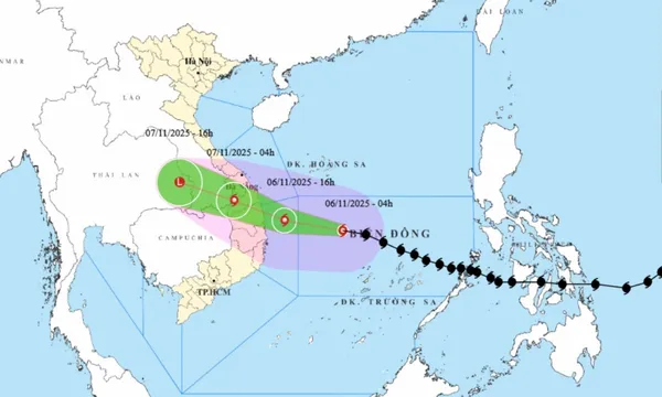 Dự báo đến 16 giờ ngày 6/11, bão ở khoảng 13,8°N – 110,3°E, cách Quy Nhơn khoảng 120km về phía Đông, duy trì cấp 14, giật cấp 17.