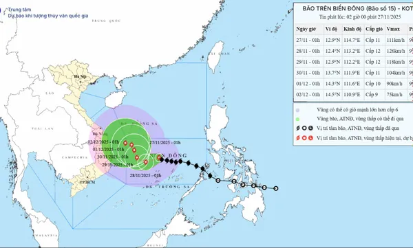 Lúc 01 giờ ngày 29/11, bão di chuyển hướng Tây Tây Bắc, sau đó là Tây Bắc với tốc độ khoảng 5 km/h; vị trí 12,9 độ Vĩ Bắc và 112,2 độ Kinh Đông. Cường độ được dự báo duy trì ở cấp 11–12, giật cấp 15. Vùng nguy hiểm được xác định từ vĩ tuyến 11,00–15,00 độ Bắc, kinh tuyến 110,50–115,00 độ Đông. Cấp độ rủi ro thiên tai vẫn ở cấp 3 đối với vùng biển phía Tây khu vực giữa Biển Đông, bao gồm vùng biển phía Tây Bắc đặc khu Trường Sa.