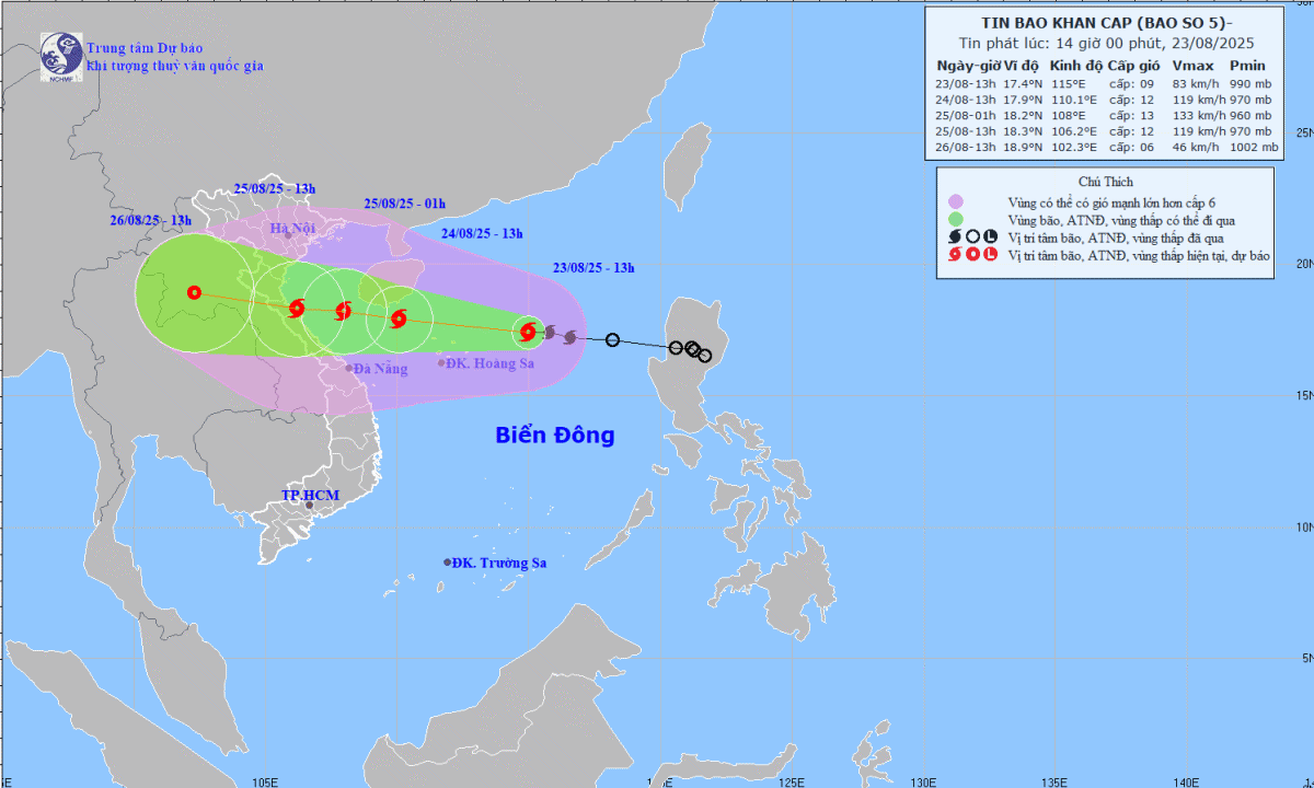 Đến 13h ngày 24/8, tâm bão ở phía tây bắc Hoàng Sa, sức gió mạnh cấp 10-11, giật cấp 14.