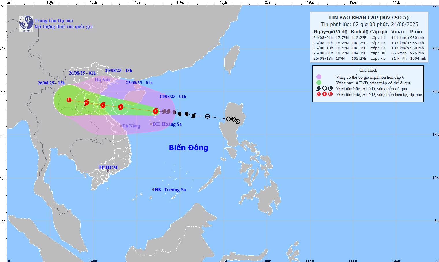 Đến 1 giờ ngày 25/8, vị trí tâm bão ở 18,2 độ vĩ Bắc; 108,2 độ kinh Đông, trên vùng biển phía nam đảo Hải Nam (Trung Quốc), cách Nghệ An khoảng 280 km về phía đông đông nam, cách Hà Tĩnh khoảng 250 km về phía đông.