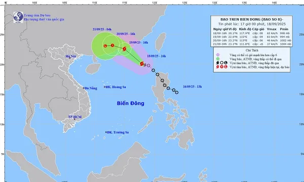 Vào hồi 16 giờ ngày 18/9, vị trí tâm bão số 8 ở vào khoảng 20,1 độ Vĩ Bắc; 117,9 độ Kinh Đông. Vùng gần tâm bão có gió mạnh cấp 8 (62-74 km/giờ), giật cấp 10. Bão đang di chuyển theo hướng Tây Bắc với tốc độ 15-20 km/h.