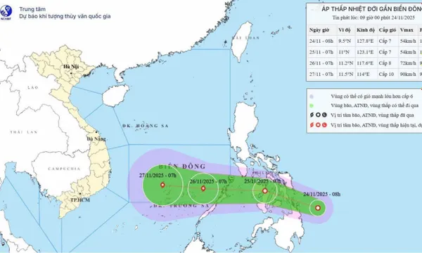 Khoảng đêm 25 rạng sáng 26/11, áp thấp nhiệt đới sẽ đi vào Biển Đông.