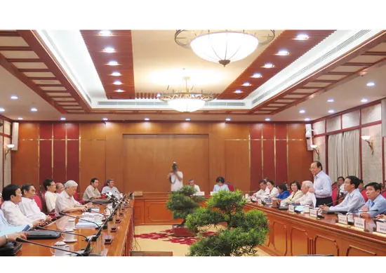 Tổng Bí thư Nguyễn Phú Trọng và các đồng chí trong Bộ Chính trị đã có buổi làm việc với Ban Thường vụ Thành ủy TPHCM. Ảnh: Hồng Hiệp/SGGP