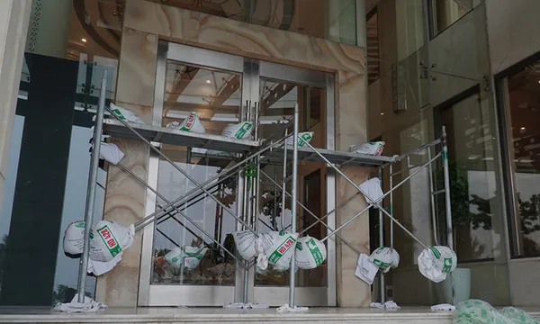 Nhiều khách sạn vừa chèn bao cát, vừa dùng ván gỗ che toàn bộ cửa kính rồi đóng khung lại chắc chắn. Phía trước cũng dán thông báo hướng dẫn lối đi cho khách.