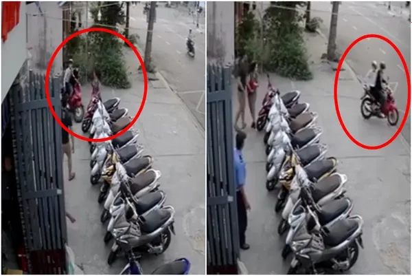 Theo đoạn clip được chia sẻ trên mạng xã hội, một cô gái đi trên một chiếc xe máy và tấp vào phía trước một cửa hàng. Sau khi đậu xe và lấy chiếc túi xách từ trong cốp xe ra và đeo vào người thì bất ngờ có 2 nam thanh niên chạy xe Wave màu đỏ, che kín mặt chạy đến áp sát và dự định giật chiếc túi xách của cô gái.
