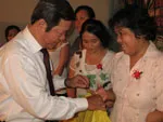 Chủ tịch LĐLĐ TP.HCM Nguyễn Huy Cận trao quà cho các nữ công nhân bị tai nạn lao động.Ảnh: LĐLDTPHCM