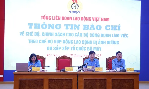 Tại họp báo ngày 19/9, Tổng Liên đoàn Lao động Việt Nam cho biết Chính phủ đã ban hành Nghị quyết 07, quy định chính sách đối với cán bộ công đoàn chuyên trách làm việc theo hợp đồng, chịu tác động từ việc sắp xếp bộ máy.