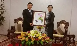 | Chủ tịch HĐND TP Nguyễn Thị Quyết Tâm tặng bức tranh hoa sen cho ông Cừu Hòa, Phó Bí thư Tỉnh ủy Vân Nam, Trung Quốc. Ảnh: Thanh Hùng |