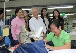 | Chủ tịch UBND TP.HCM Lê Hoàng Quân thăm hỏi công nhân tại Công ty May Oasis (Củ Chi). Ảnh: PLO. |