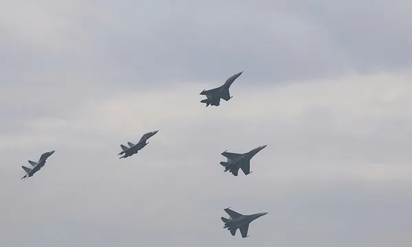 Sáng nay, 24/8 có sự xuất hiện của biên đội 5 chiếc 'Hổ mang chúa' Su-30MK2 - tiêm kích đa năng của Không quân Nhân dân Việt Nam bay tập luyện theo đội hình. Đây là tiêm kích hiện đại nhất của Không quân Việt Nam