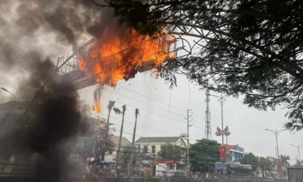 Vụ cháy không thiệt hại về người nhưng cổng chào làm bằng bảng điện tử bị thiêu rụi hoàn toàn.
