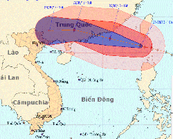 | Vị trí lúc 14 giờ ngày 21-9 và dự báo đường đi của bão số 9. Nguồn: Trung tâm Dự báo khí tượng Thuỷ văn Trung ương |