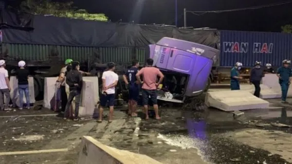 Khi còn cách ngã 4 giao nhau với đường ĐT741 khoảng chừng 100m thì bất ngờ mất lái, húc văng một khúc dải phân cách. Sau tai nạn, cabin bị rơi ra khỏi xe khiến tài xế và phụ xe mắc kẹt bên trong.