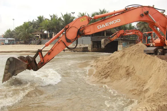 Xử lý một đường cống nước thải chảy ra bãi tắm phía đông bờ biển Đà Nẵng, nơi có các khu nghi dưỡng chủ lục phục vụ du lịch - Ảnh: TRƯỜNG TRUNG