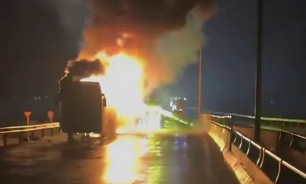 Ngọn lửa bốc cao hàng chục mét kèm nhiều tiếng nổ khiến các phương tiện khác phải dừng từ xa, giao thông trên tuyến ùn ứ khoảng 3 km. Lực lượng chức năng sau đó có mặt, triển khai khống chế đám cháy.