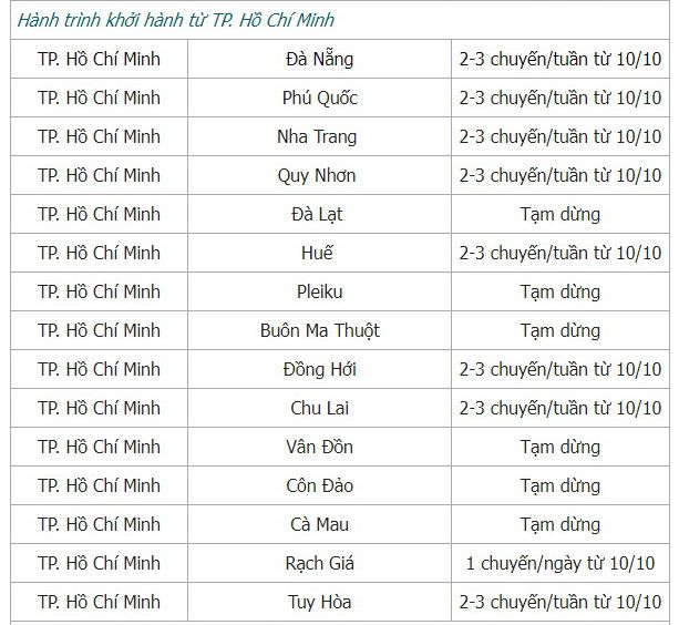 Theo tinh thần này, Vietnam Airlines và Pacific Airlines dự kiến khôi phục các đường bay 2 chiều giữa TPHCM và Thanh Hóa, Nha Trang, Tuy Hòa, Quy Nhơn, Phú Quốc với tần suất mỗi hãng 1 chuyến/ngày. Vietnam Airlines cũng mở lại đường bay hai chiều giữa TPHCM và Huế với tần suất 1 chuyến/tuần, đường bay một chiều từ Vinh đến TPHCM với tần suất 2 chuyến/tuần.
