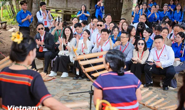 Du khách hòa trong không gian văn hóa đồng bào tại Làng Văn hóa Du lịch các dân tộc Việt Nam - Ảnh: Vietnam+