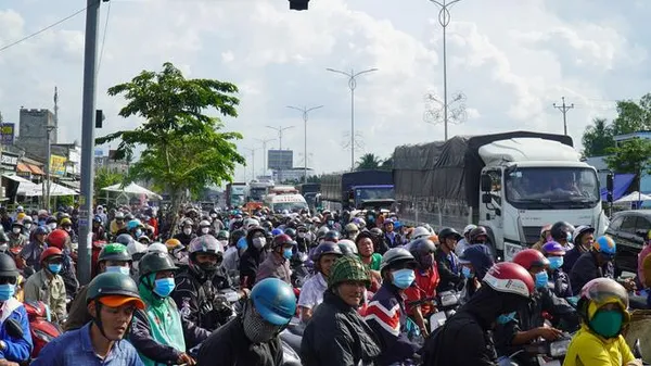 Từ sáng hôm qua 23/1, lượng lớn xe máy và ô tô các loại hướng từ TPHCM phải "rồng rắn" nối đuôi nhau chờ qua cầu Rạch Miễu để về các tỉnh Bến Tre, Trà Vinh...