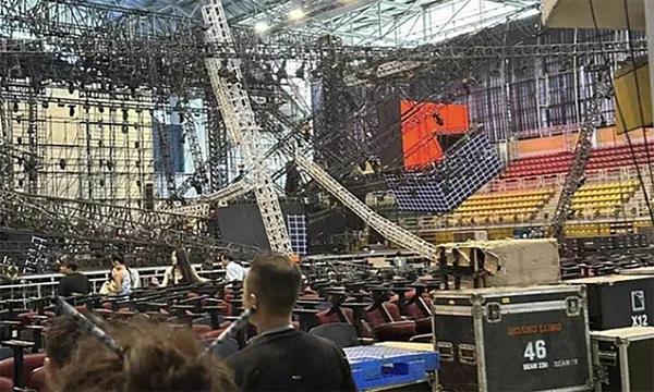Hệ thống đèn đổ xuống khi các chuyên viên kỹ thuật đang lắp đặt sân khấu. Hiện trường có nhiều khung sắt hình vuông, có kết cấu đan xen rơi xuống sàn diễn, hàng ghế ngồi khu vực khán giả. Sau khi vụ việc xảy ra, công an quận 11 và các đơn vị liên quan đã có mặt, phối hợp kiểm tra hiện trường để làm rõ nguyên nhân.