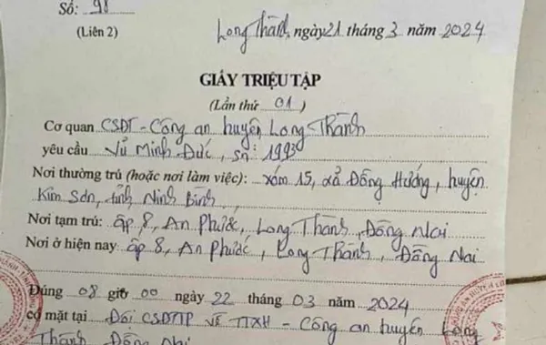 Thông tin ban đầu, ngày 22/3, Công an huyện Long Thành triệu tập anh Vũ Minh Đức đến trụ sở làm việc liên quan vụ án gây rối trật tự công cộng đã khởi tố trước đó.