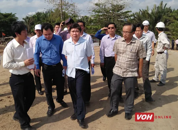 Chủ tịch UBND TP Nguyễn Thành Phong kiểm tra tiến độ thực hiện 4 dự án đường chính khu đô thị mới Thủ Thiêm. (Ảnh: Đình Sang)