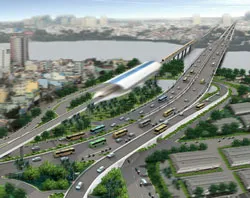 | Phối cảnh khu vực cầu Sài Gòn nhìn từ bên phải sang trái, bao gồm: cầu Sài Gòn 2, cầu Sài Gòn hiện hữu và cầu đường sắt đô thị (tuyến metro Bến Thành - Suối Tiên) - Ảnh: TNO |