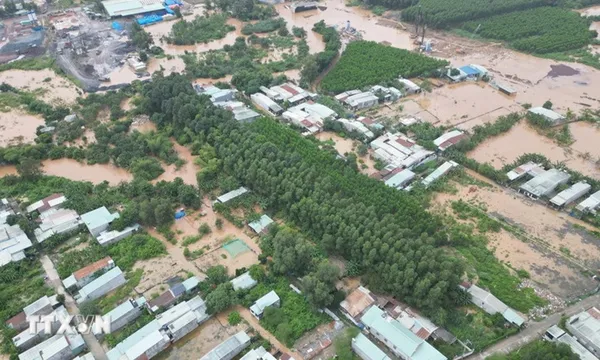 Ngày 13/9, Ban giám hiệu Trường THCS Phước Tân 1 (phường Phước Tân, TP Biên Hòa, Đồng Nai) cho biết nước sông Buông dâng cao đã khiến toàn bộ sân trường cùng nhiều phòng học tầng trệt bị ngập sâu.