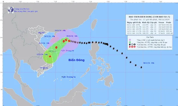 Dự kiến từ sáng 10/11, bão sẽ chuyển hướng Tây Nam, di chuyển chậm về phía Hoàng Sa, sau đó tiến về vùng biển ven bờ các tỉnh Trung và Nam Trung Bộ với cường độ giảm dần.