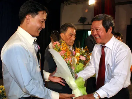 | Ông Nguyễn Huy Cận - Chủ tịch LĐLĐ TPHCM, tặng hoa cho gia đình đảng viên gương mẫu Trương Đình Thanh. Ảnh: NLĐ |