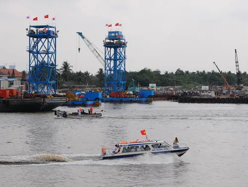 Đốt hầm đầu tiên đang được dìm xuống sông Sài Gòn. Ảnh: TTO |