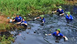| Các bạn sinh viên tình nguyện tham gia khơi thông rạch Ông Đội 1, quận 7. Ảnh: PNO |