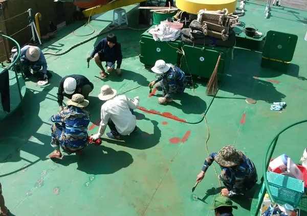 Cán bộ đoàn viên sơn sửa tau sau đi biển về.