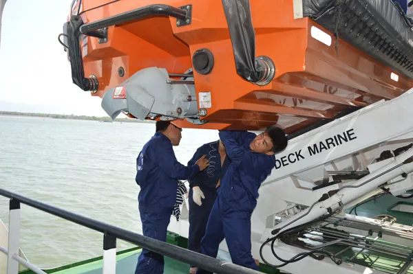Đoàn viên thanh niên Tàu csb 8001 bảo quản hệ thống xuồng tuần tra trên tàu.