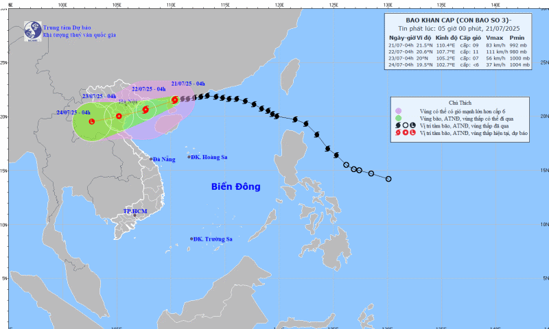 Theo dự báo của Trung tâm Dự báo Khí tượng thủy văn quốc gia, bão số 3 sẽ ảnh hưởng từ chiều tối 21/7, gây gió mạnh, mưa lớn, nguy cơ cao xảy ra lũ ống, lũ quét, sạt lở đất ở trung du, miền núi và ngập úng ở vùng trũng, đô thị.