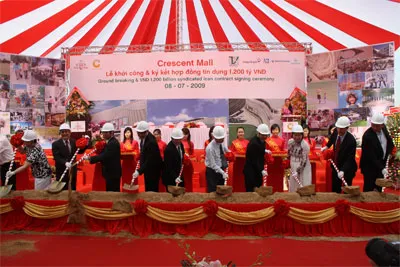 (VOH) - Sáng qua 8/7, tại khu Hồ bán Nguyệt trong khu đô thị mới Phú Mỹ Hưng quận 7, TP HCM đã tổ chức lễ khởi công & ký kết hợp đồng tín dụng 1200 tỷ đồng cho dự án Crescent Mall. Phó chủ tịch UBND TP Nguyễn Trung Tín đã đến dự và làm lễ khởi công.