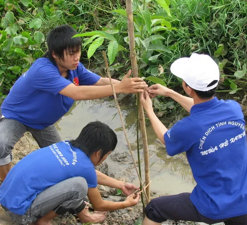 Các bạn trẻ trồng cây xanh dọc tuyến đê bờ hữu sông Sài Gòn sáng 7-3 -Ảnh: TTO |